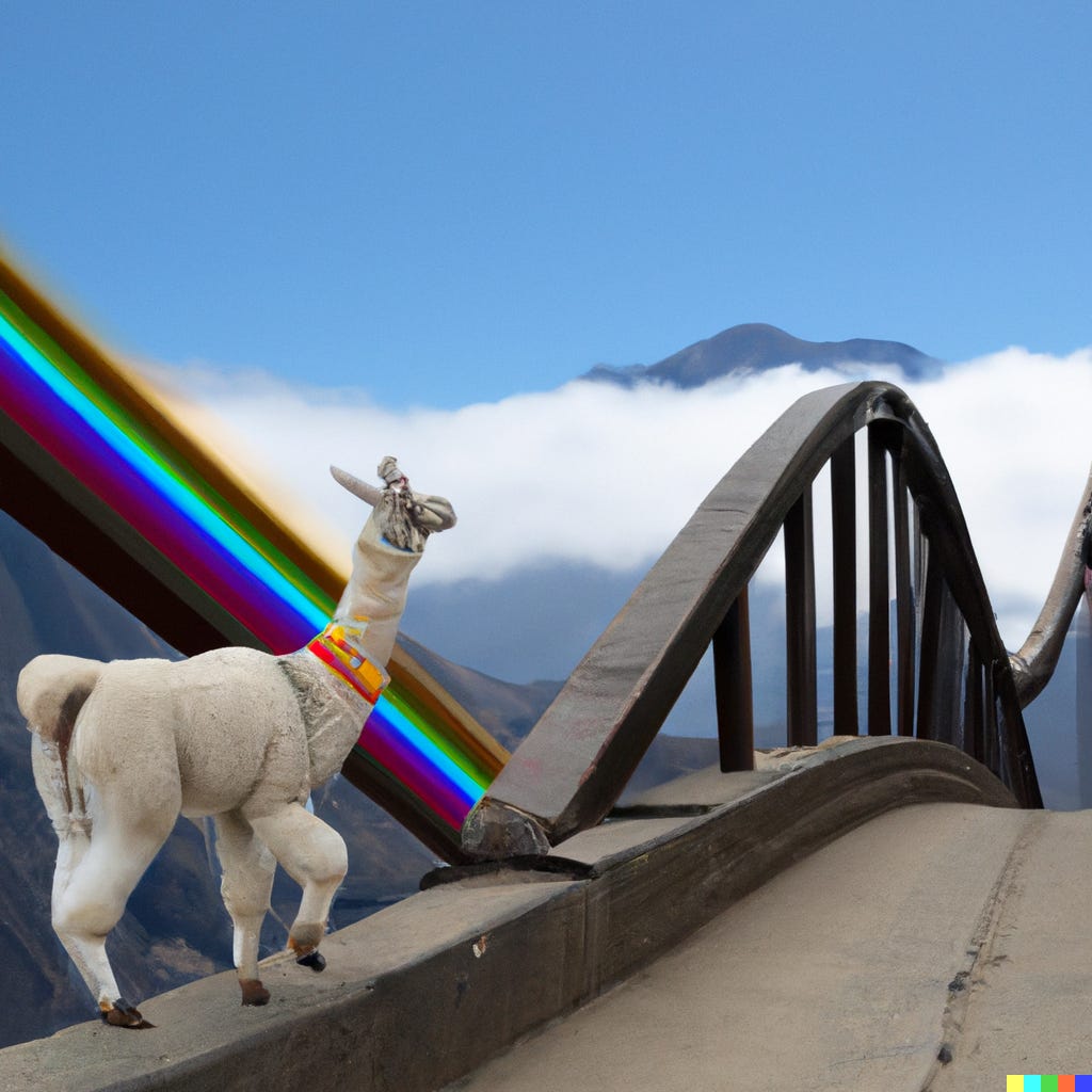 SCIENCE TEST TIME! I asked the woman sitting next to me to list out a string of disparate words to describe an image that she wanted to see. After the surprise of a large random dude abruptly asking her such an odd question wore off, she chose “ Rainbow Llama Crossing Bridge In Mountains”